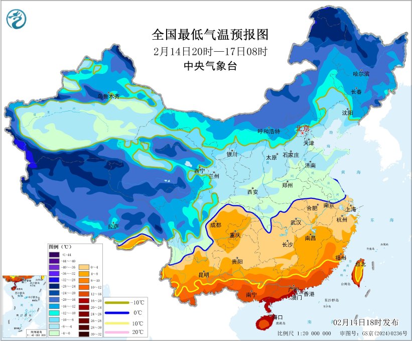 受寒潮影响,预计,2月14日20时至17日08时,内蒙古中西部和东北部、东北地区大部、华北北部和东南部、黄淮、江淮、江汉、江南大部、西南地区东南部、华南北部等地部分地区将先后降温6~10℃,其中,内蒙古东北部、东北地区东部、江南西部和贵州等地局地降温可达12℃以上。2月17日凌晨最低温度0℃线将南压到江淮、黄淮南部、江汉西部至四川北部一带。