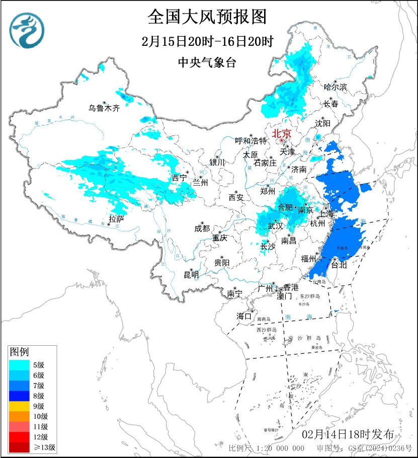 2月15日20时至16日20时,内蒙古东部、黄淮南部、江淮、江汉东部、青藏高原北部等地有5级左右平均风、阵风6~8级;黄海南部海域、东海南部海域、台湾海峡将有5~7级、阵风8级的东北风。